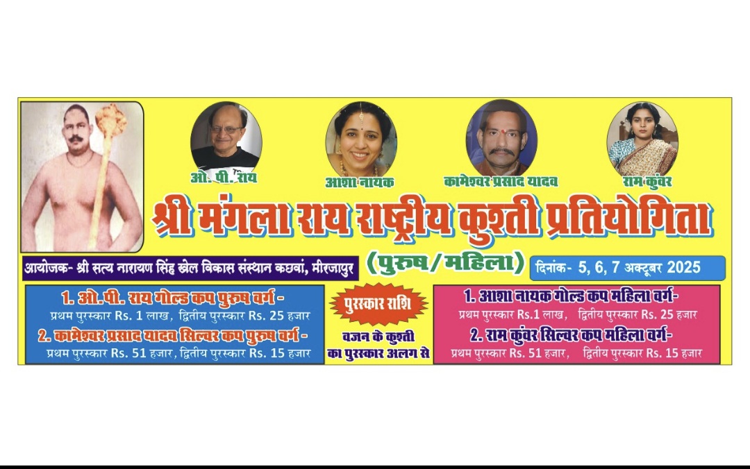 मीरजापुर : स्व. श्री सत्यनारायण सिंह खेल विकास संस्थान, अखाड़ा कछवाँ, मीरजापुर द्वारा मीरजापुर में अनेक वर्षों की भांती श्री मंगला राय स्मारक राष्ट्रीय कुश्ती प्रतियोगिता का आयोजन इस वर्ष भी 5, 6 एवं 7 अक्टूबर 2025 को किया गया है। यह कुश्ती प्रतियोगिता स्व. सत्यनारायण सिंह द्वारा सौ वर्षों से भी ज्यादा समय से प्रारम्भ की गई शरवद पूर्णिमा के अवसर पर आयोजित की जाती रही है।